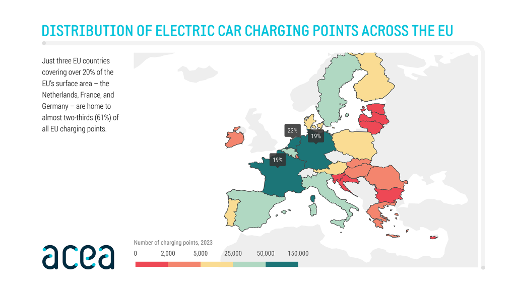 • Just three EU countries covering over 20% of the EU’s surface area – the Netherlands, France, and Germany – are home to almost two-thirds (61%) of all EU charging points.