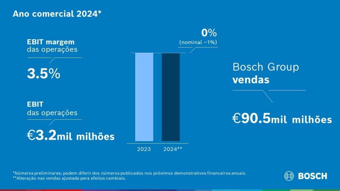A Bosch, fornecedora de tecnologia e serviços, gerou uma receita de vendas de 90,5 mil milhões de euros em 2024, de acordo com números preliminares. Em termos nominais, isso representa uma queda de 1 por cento em relação ao ano anterior e, ajustado para os efeitos cambiais, é aproximadamente igual ao ano anterior. Isso equivale a uma margem EBIT das operações de 3,5 por cento. “Apesar de todos os nossos esforços, a Bosch também não foi completamente imune aos desenvolvimentos económicos, mas tivemos um desempenho respeitável em comparação com os nossos pares do setor”, afirma Stefan Hartung, presidente do conselho de administração da Robert Bosch GmbH, referindo-se aos números preliminares dos negócios publicados pela empresa. “As nossas tecnologias para a mobilidade e casas do futuro continuam a ser áreas-chave de crescimento para a empresa”. Além disso, Hartug destaca ainda os esforços para fortalecer a competitividade e o crescimento no ano fiscal de 2024 por meio de decisões estratégicas de portfólio envolvendo aquisições e desinvestimentos, acrescentando a necessidade que a empresa teve de fazer certos ajustes estruturais.